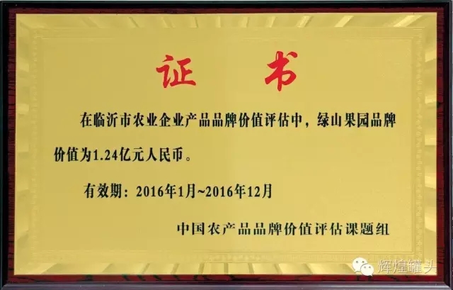 近日,由浙江大學CARD中國農(nóng)業(yè)品牌研究中心發(fā)起,中國農(nóng)產(chǎn)品品牌價值評估課題組對臨沂市農(nóng)業(yè)企業(yè)產(chǎn)品品牌價值評估報告出爐。山東輝煌食品有限公司旗下品“綠山果園”品牌價1.24億元人民幣。這是輝煌公司眾多榮譽中近日又獲得一項殊榮,輝煌人將繼續(xù)秉承“互利共贏、基業(yè)長”的經(jīng)營理念,“誓做中國罐頭行業(yè)第一品牌”的企業(yè)愿景,將企業(yè)做大做強,造福員工,回饋社